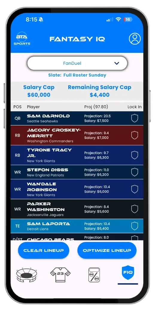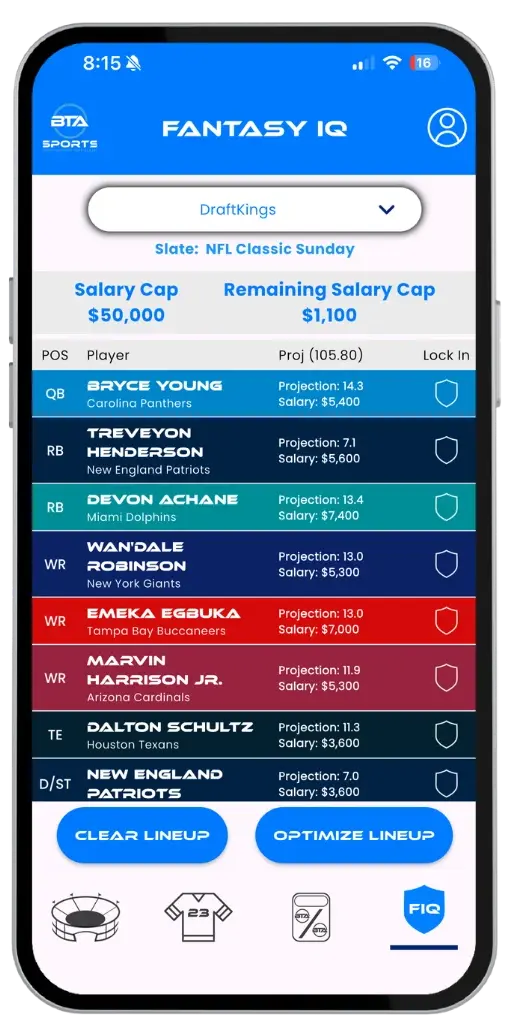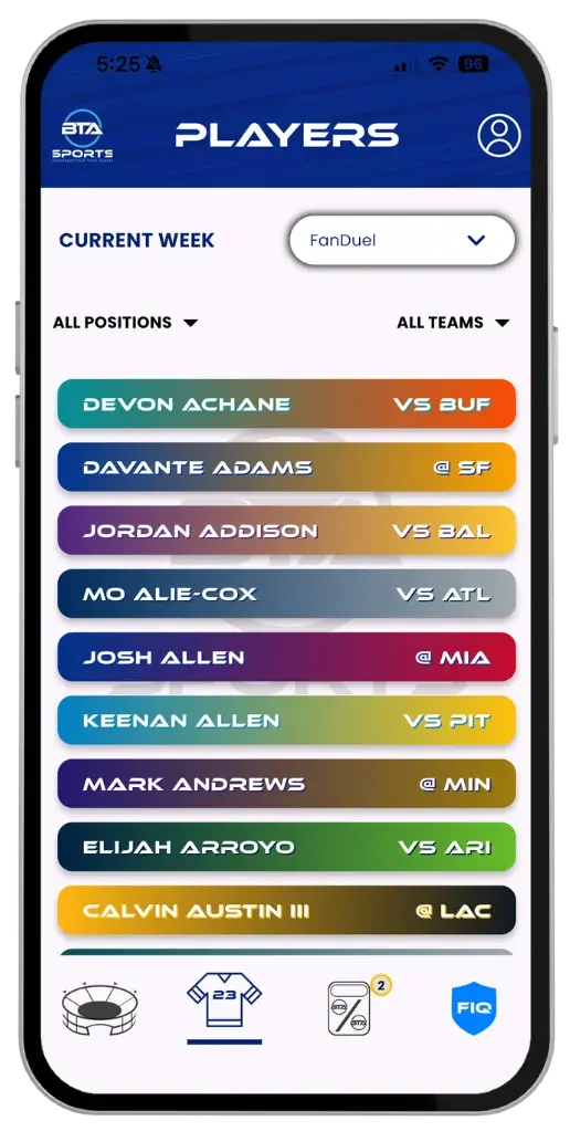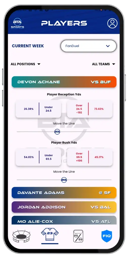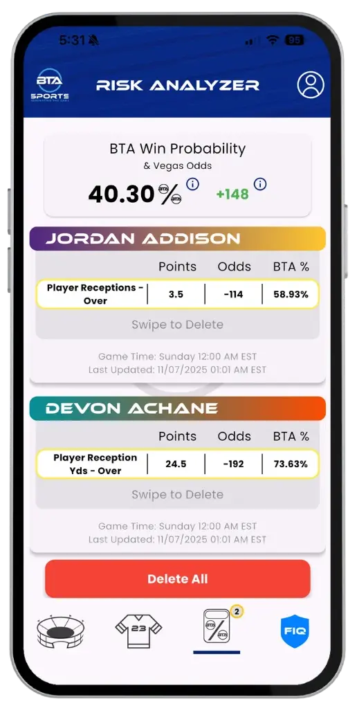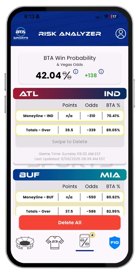Our platform delivers NFL game day predictions powered by advanced AI. Explore win/loss probabilities, over/under projections, player-level insights, and dynamic risk ratings. With BTA’s interactive tools and Proprietary AI Risk Engine, you’re always in control of how you analyze and refine your strategy.